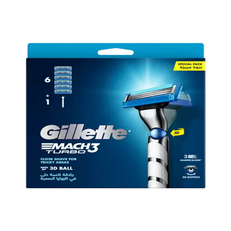 Gillette Mach3 Turbo 3D Ball Razor Handle 6Up is designed with advanced 3D motion technology to adapt to every contour of your face, ensuring precision and comfort. The pack includes 6 Mach3 Turbo blades with stronger-than-steel sharpness for close, smooth shaves that last. Its ergonomic handle and ball design provide superior grip and flexibility, reducing irritation and tugging. Perfect for daily grooming, the Gillette Mach3 Turbo 3D delivers barber-quality results at home. Available now at SFOMall.pk for men in Pakistan.